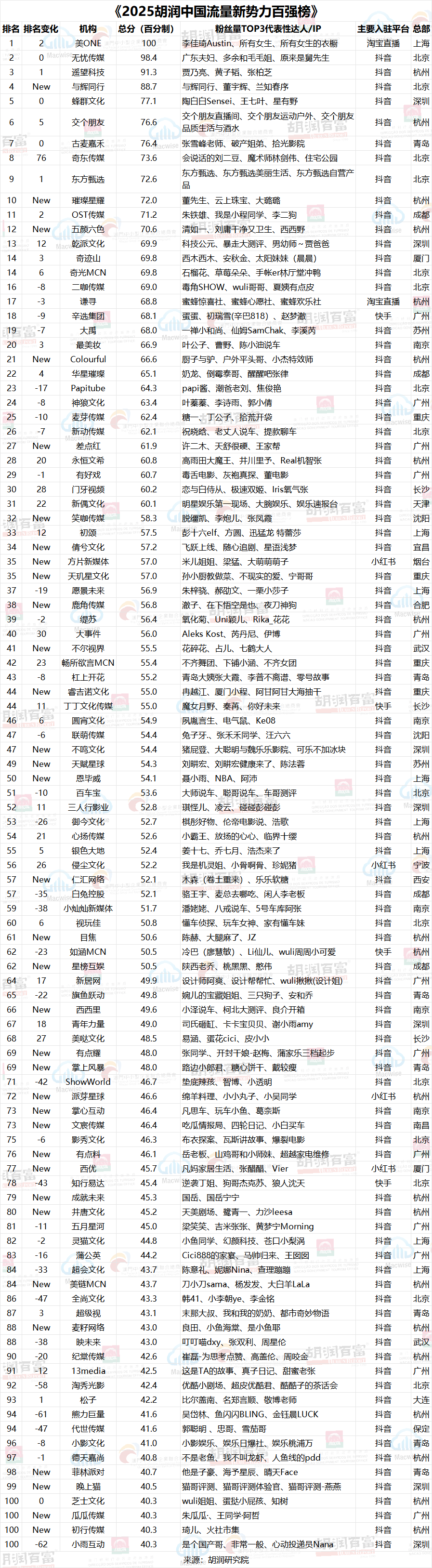 活动中,胡润研究院携手澳智通科技有限公司、澳门中小型企业联合总商会联合发布《2025胡润中国流量新势力百强榜》,上榜机构平均拥有2.8亿粉丝,平均签约达人530人。百强机构中七成位于杭州、北京、广州、上海、深圳、青岛这六大城市。